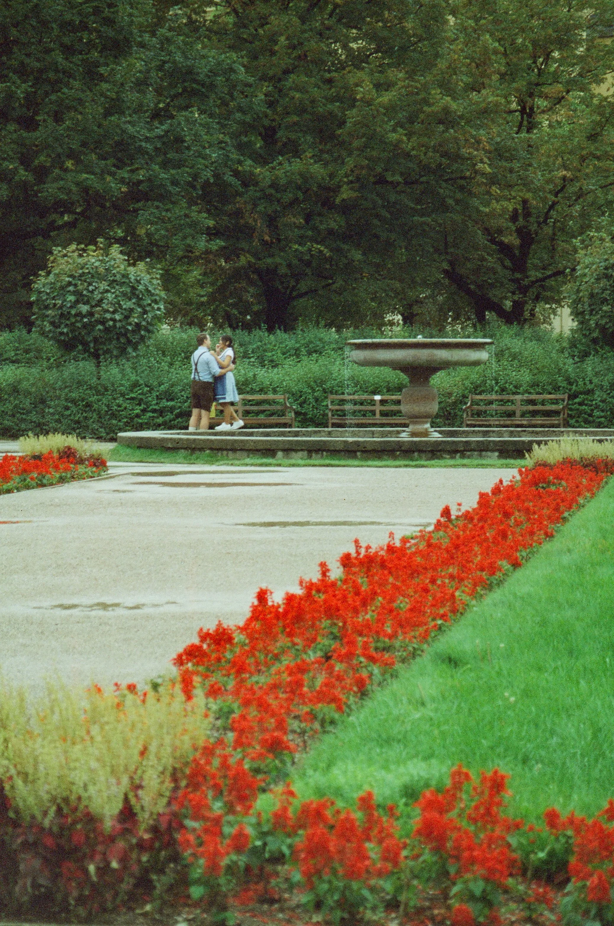 Couple in traditional attire standing by a fountain in a park with red flowers and green trees.