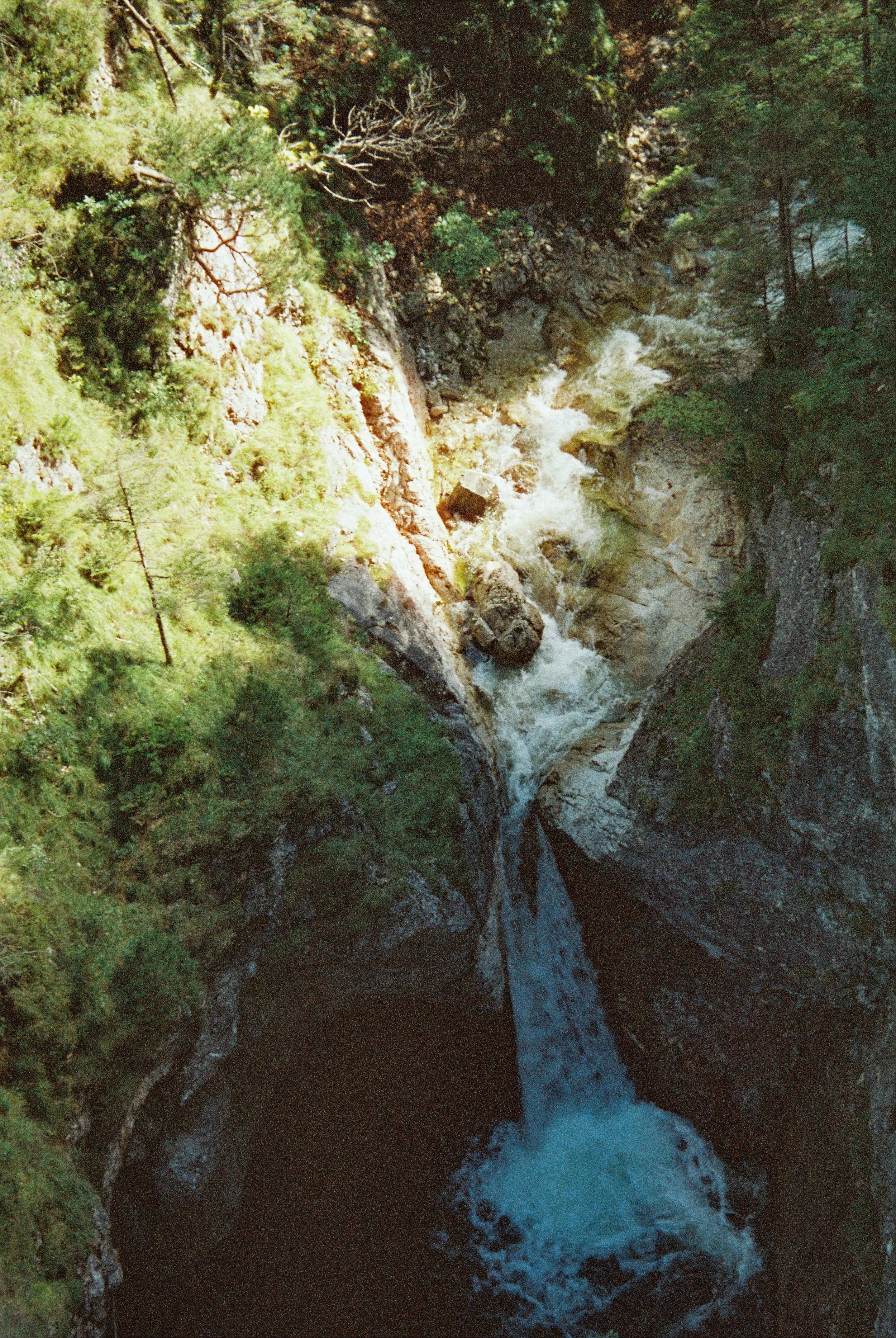 Aerial view of a waterfall flowing into a rocky gorge surrounded by dense greenery and trees.