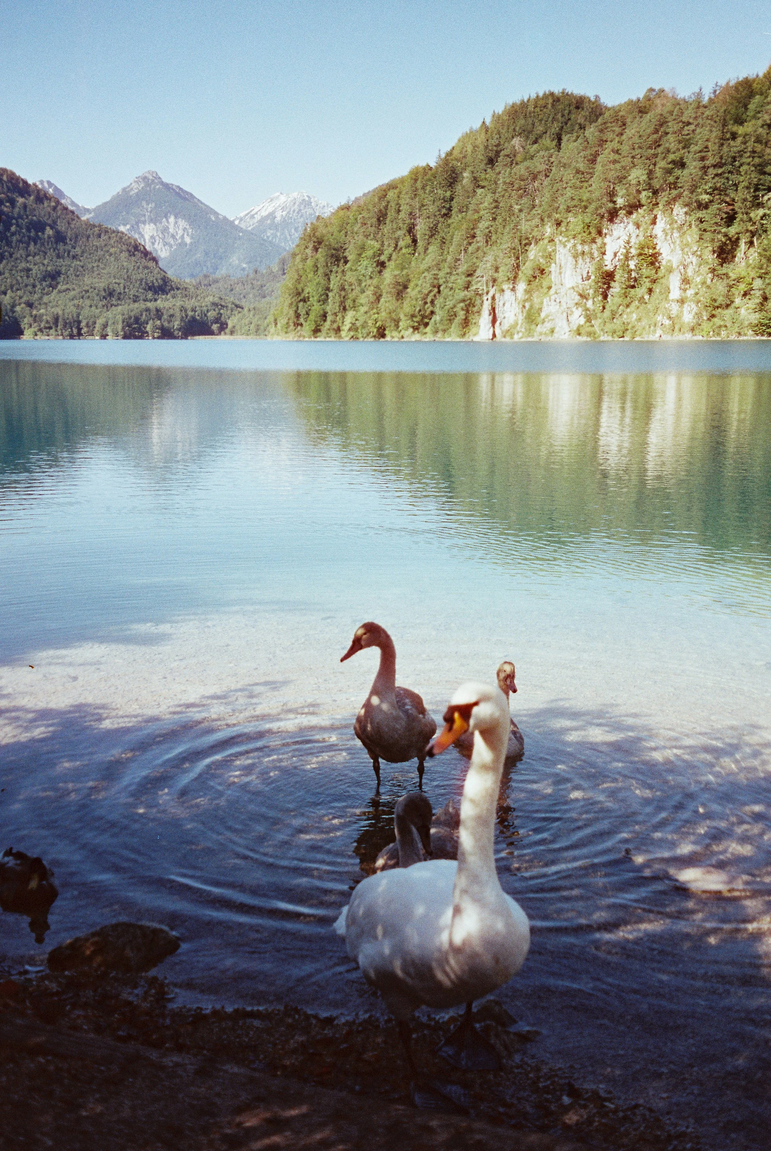 Swans and cygnets at the edge of a mountain lake with a forested backdrop and distant mountains.