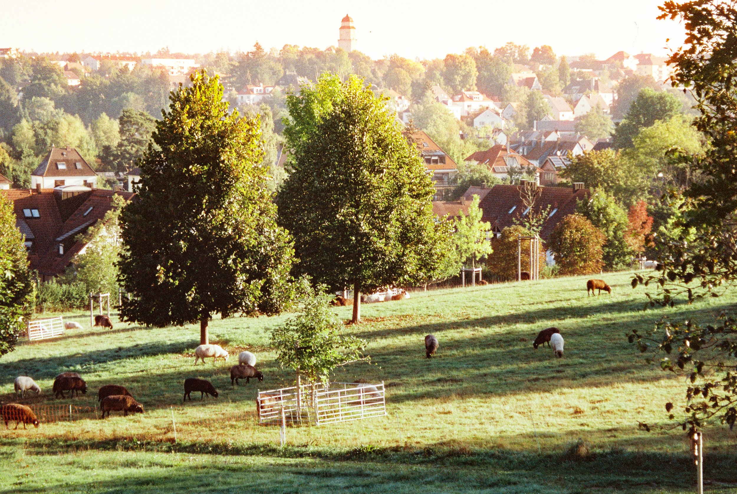 Pasture with grazing sheep, trees, and a distant village view