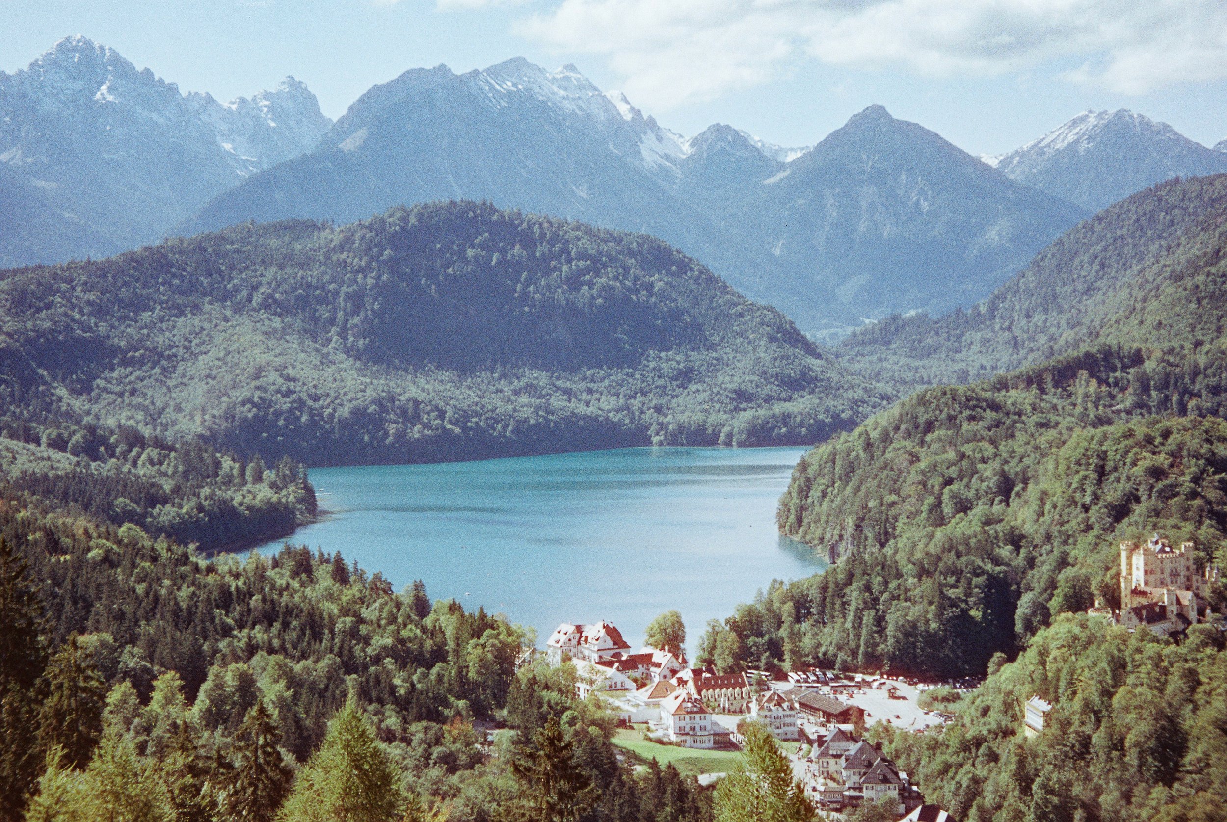 Scenic view of a turquoise lake surrounded by lush green forests and snow-capped mountains with a small town in the foreground.