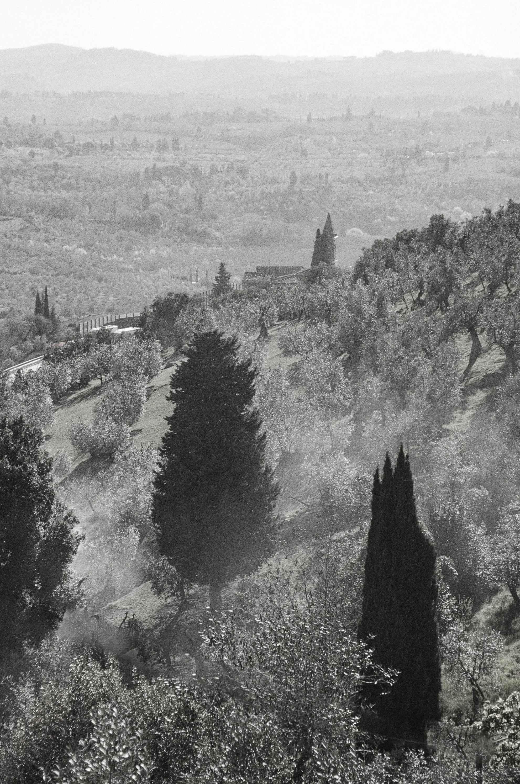 Black and white landscape of the Tuscan countryside with rolling hills, olive trees, and cypress trees. The city of Florence, including the Florence Cathedral dome, is visible in the background.