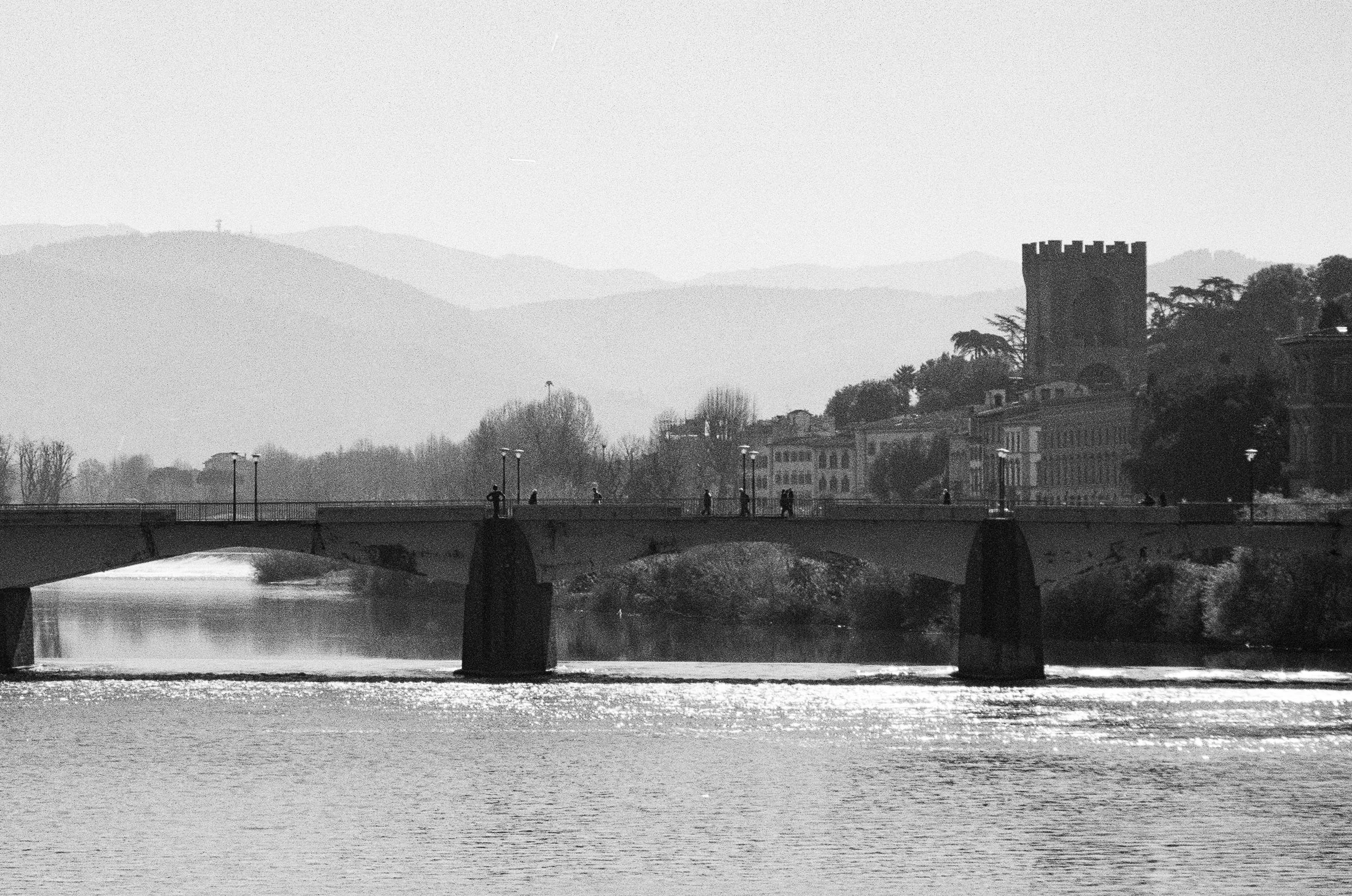 Black and white image of a river with a bridge and a tower; background features rolling hills.