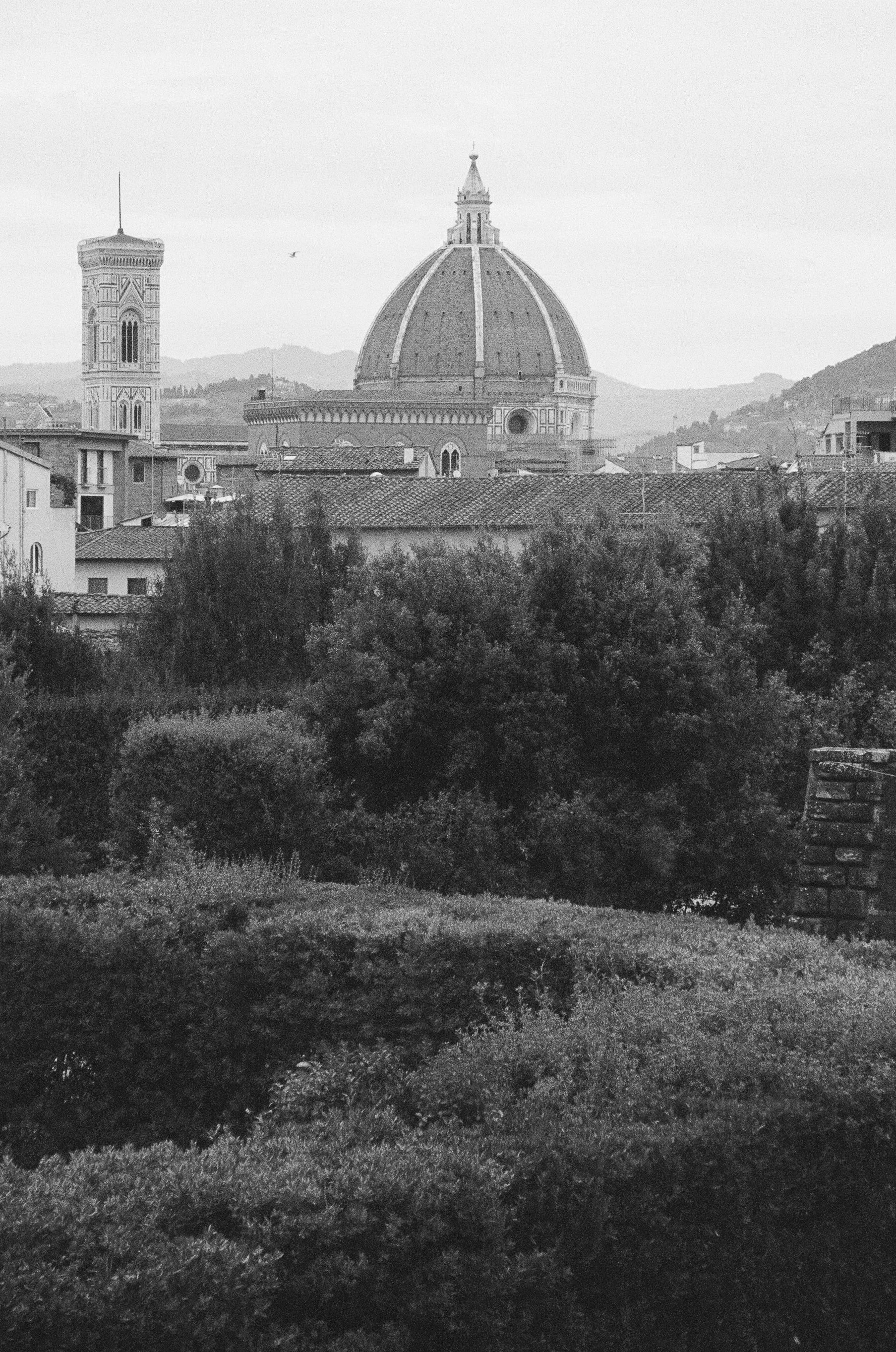 Black and white photo of Florence skyline with cathedral dome and bell tower.